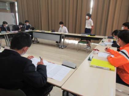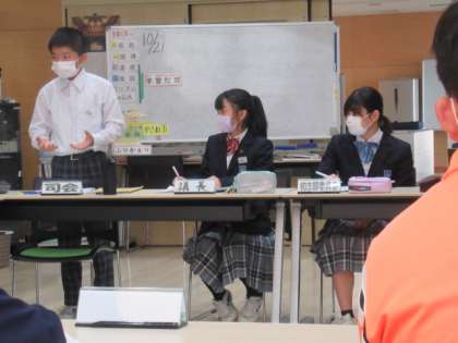 後期初めての中央自治会が開催されました。静浦小中一貫学校の新リーダーたちが集まり、よりよい学校になるようみんなで考えを出し合いました。