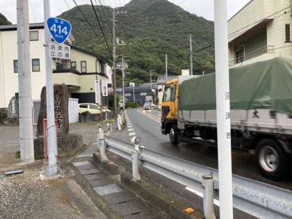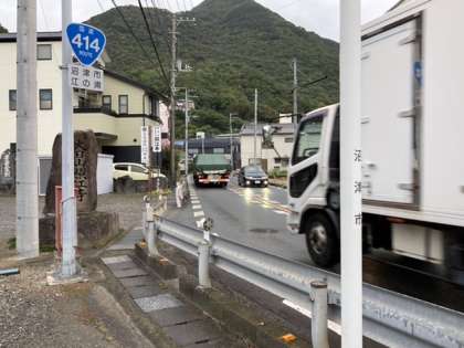 傘をさして414号の歩道を歩くと、後ろから来る自動車が減速してくれます。
