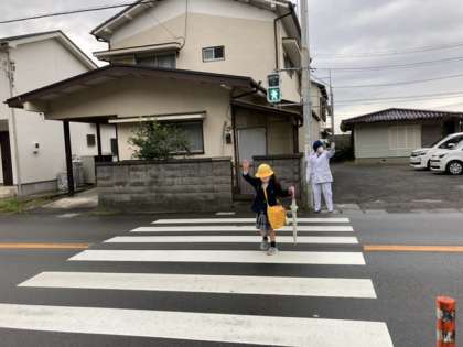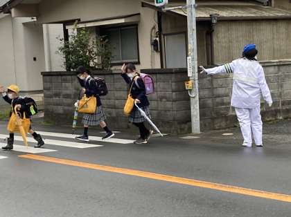 傘をさしての登校ということで、交通指導員の皆さんが来てくれました。