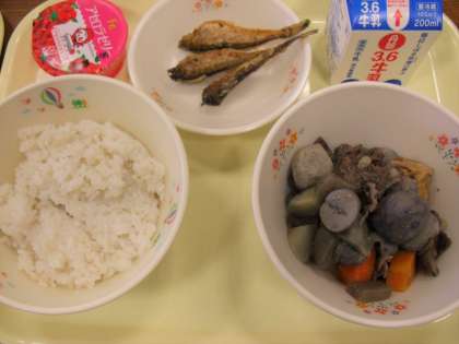 今日のメニューは、いも煮、ハタハタのから揚げ、麦ごはん、アセロラゼリー、牛乳です。