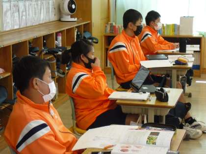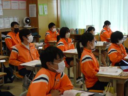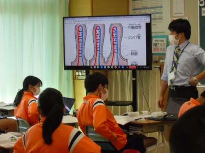 消化された栄養は、どのようにして体内に吸収されるのか?について、先生が説明しています。次々に映し出される資料の画像を、興味津々のまなざしで見つめていました。