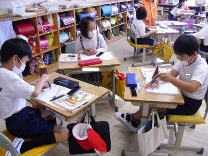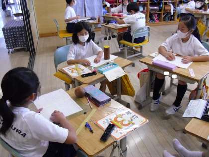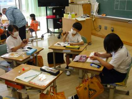 円の入ったいろんな形は、角度を変えると、どう見えるか、模型を使ってグループごと、調べています。ボール、たまご、はしら、コーンに分けられそうです。