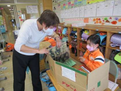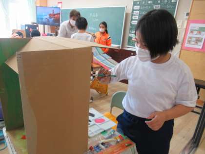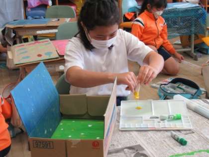 段ボールを使って、色を塗ったり、スタンプを押したりして自分の世界を作りました。今日は、友達に、自分の作品をどのように見せればいいのか考えながら進めていました。