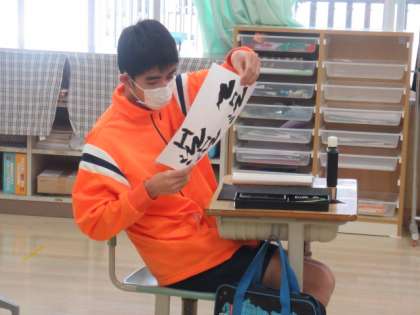 書写では、4文字の行書の作品に挑戦していました。半紙に、バランスよく字を書いていました。