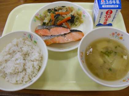 今日のメニューは、焼きざけ、豚肉とはるさめの炒めもの、じゃがいものみそ汁、麦ごはん、牛乳です。