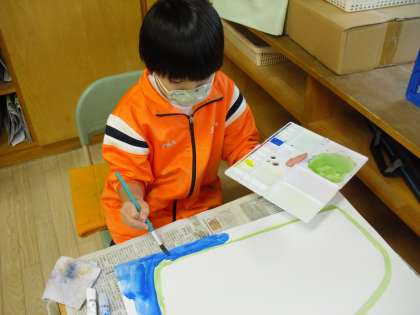 小D 絵の具を使って絵をかいています。きれいな色がでたと笑顔で活動しています。