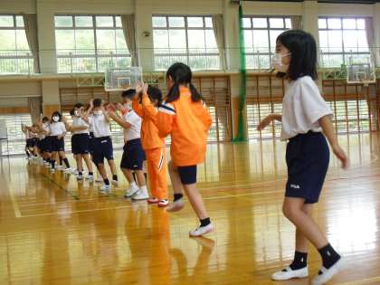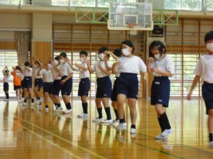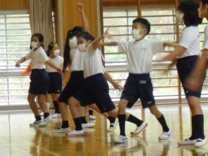 昨日習ったダンスをマスターするために、練習を続けています。今日は発表に向けて、隊形を変更しました。