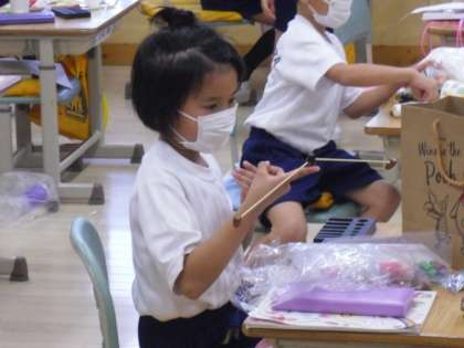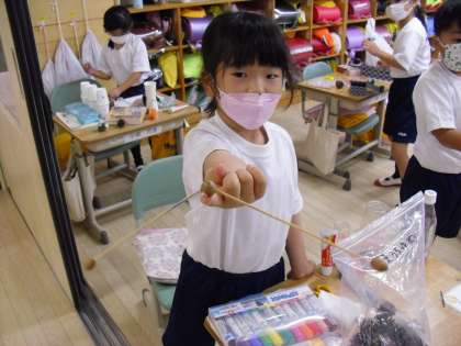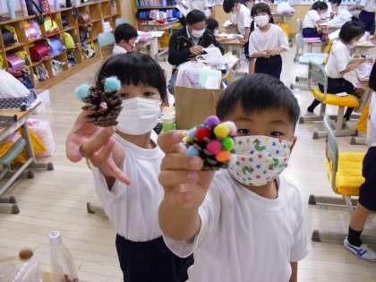 「秋の あそび」先週に続き、どんぐり や まつぼっくり、紙コップなどを使って、いろいろな 遊び道具を作りました。上手にできたと見せにきてくれました。