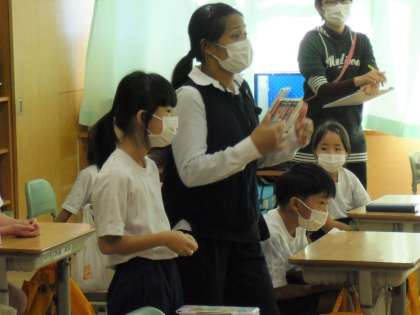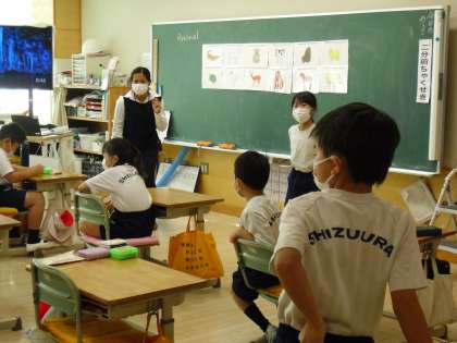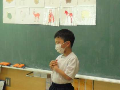 Animal のイラストが黒板に用意されました。前に出た人はジェスチャーでヒントを出します。わかった人が英語で答えます。なかなか正解が出てこない難しい問題もありました。