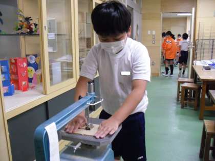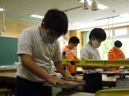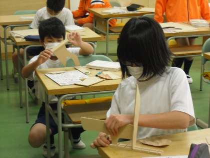 「糸のこスイスイ」糸のこを使って木材を設計通りに切っています。やすりをかけて形をととのえたパーツを組み合わせていきます。どんな作品ができあがるか楽しみです。