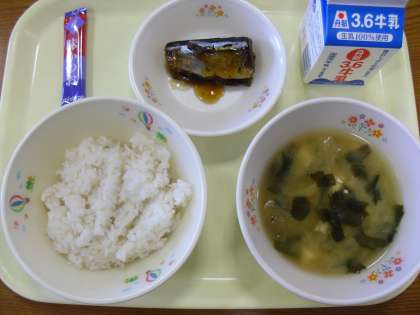 今日のメニューは、さんまのカボスレモン煮、玉ねぎのみそ汁、麦ごはん、ふりかけ、牛乳です。