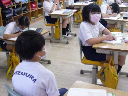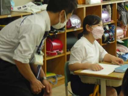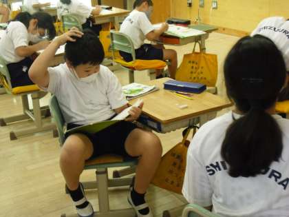 2つの水そうに入った水の量の差を求めます。この問いを解くために、少数のひき算のしかたを個人で考えました。自分の考えを、友達や先生に聞いてもらっています。
