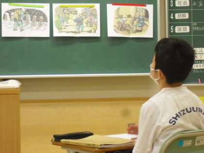 8年生 黒板にはられたさし絵を見て、自分の言葉でお話の説明をしています。