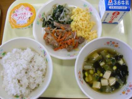 今日のメニューは、ビビンバ(肉、ナムル、たまご)、ごはん、わかめスープ、杏仁風プリン、牛乳です。