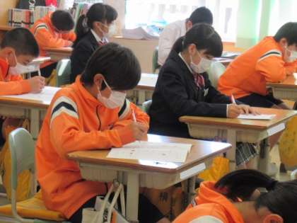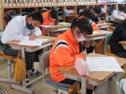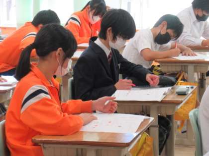 前の時間にやったテストの返却をしていました。もう一度、先生と問題を見直し、学習のまとめをします。