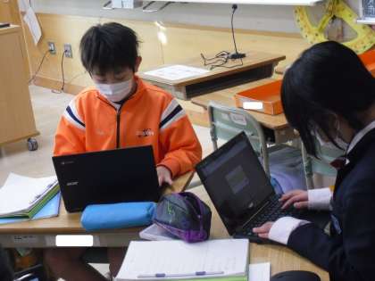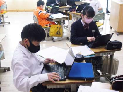 先週、漁師さんに聞いた話をもとに、「静浦漁港はどんな漁港か」情報をまとめます。個人でChromeBookにまとめたことをグループで確認していました。