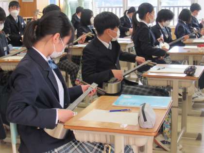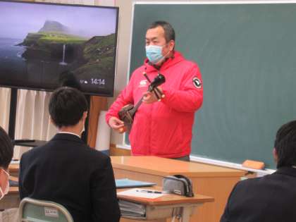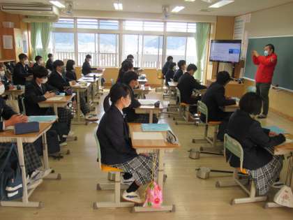 1月17日、8年生は、ゲストティーチャーをお迎えし、沖縄の文化について学びました。来年度4月には、沖縄に修学旅行に行く予定ですので、どの子も、沖縄、久米島について知りたいことがたくさんあります。