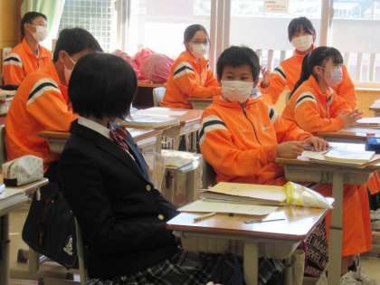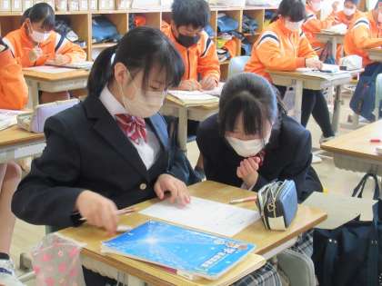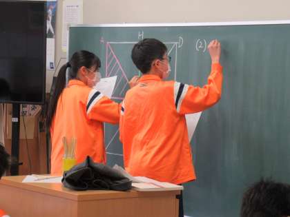 7年生の数学では、正方形を分割した図形について考えていました。黒板にかかれた友達の考えについてみんなで話し合いをしていました。