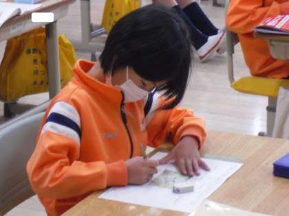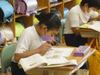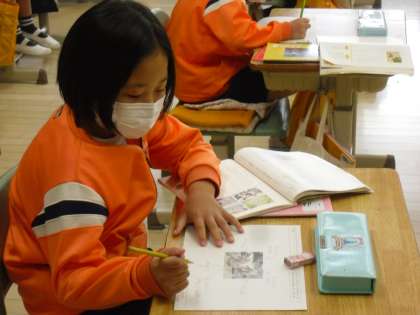 「写真が動き出す」プリントの写真を見て、どんな物語が想像できるか考え、だれが、いつ、どこで、どんなことをしたのか書きこんでいます。