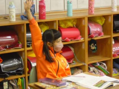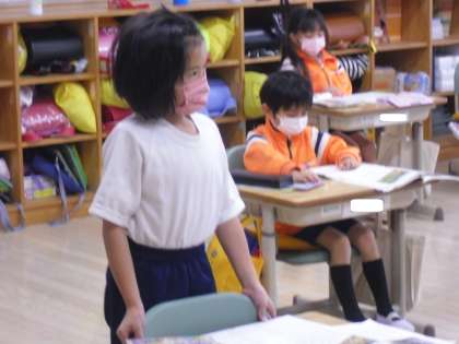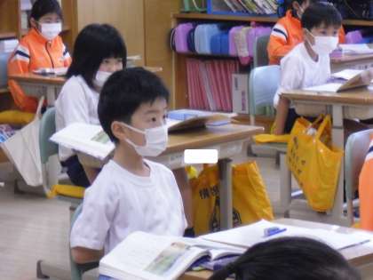 「めだかのぼうけん」文章を読んで、田んぼのようすと、めだかのようすに分けてまとめをしています。まとめの時間が終わって発表しているところです。