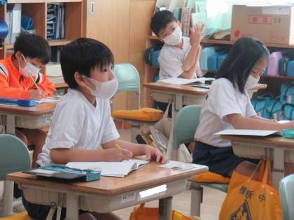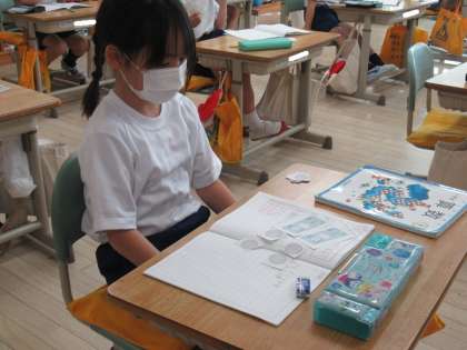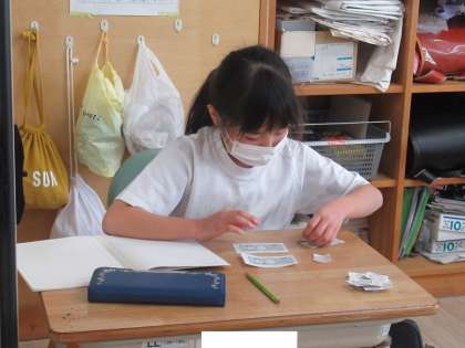 2年生の算数では、一人一人の机に千円札2枚、百円玉4枚が分けられていました。(本物ではありません。)この2400円を全部百円玉にするにはどうしたらいいかを考えていました。
