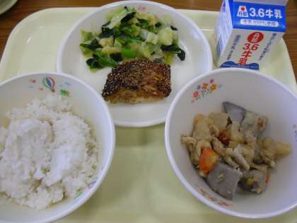今日のメニューは、さばのてり焼き、おひたし、おけんちゃん、麦ごはん、牛乳です。