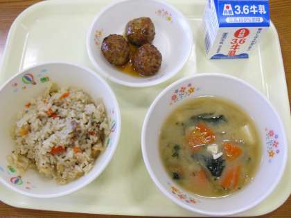今日のメニューは、ひじき入りつくねのからめ煮、するが汁、豚肉と切り干し大根のごはん、牛乳です。