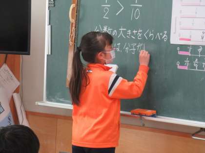 分数の大きさを比べるには、どのような方法を使えばいいのかを考え、分数を数直線上に表して比べると分かりやすいことに気付きました。