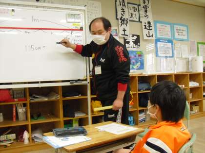 小D 算数 長さの勉強をしているところです。ホワイトボードに書かれた115cmは何m何cmか考えています。
