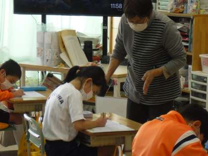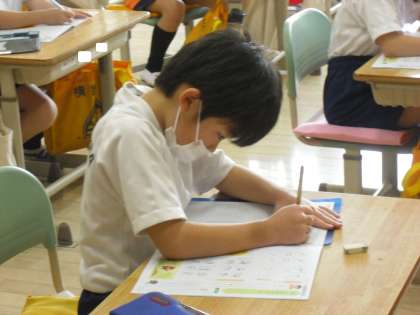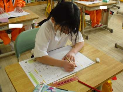 二年生のまとめをしていました。にている字や、画の長さと方こうに注意して書いています。良い姿勢で集中して取り組んでいます。