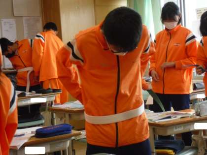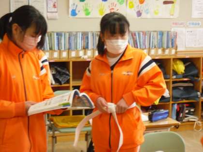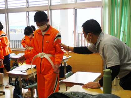 感染症の影響で柔道の授業を武道場で行うことができません。教室で、実技書を見たり、先生の説明を聞いたりして、帯の結び方を確認していました。なかなか難しいようで、先生から「合格」をもらうのに苦労していました。