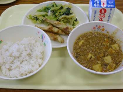 今日のメニューは、豆腐のカレー煮、わかさぎフリッター、ごま酢和え、ごはん、牛乳です。