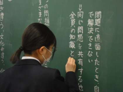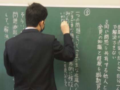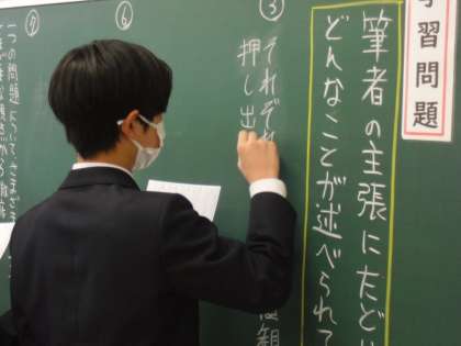 「『文殊の知恵』の時代」文章を読んで、筆者の主張にたどりつくまでに、どんなことが述べられているかまとめ、黒板に発表しています。