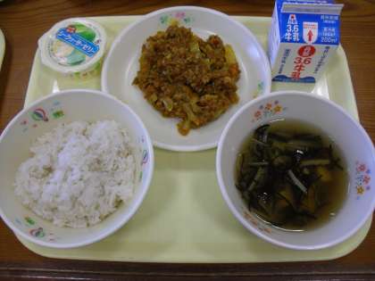 今日は沖縄献立です。メニューは、タコライス、もずくスープ、シークワーサーゼリー、牛乳です。