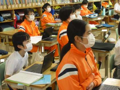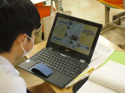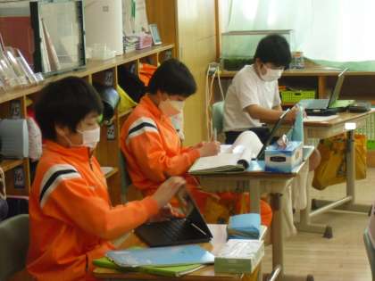 「新聞にまとめよう」ChromeBookを見て、参考になるレイアウトをさがしたり、ドキュメントに残した記事を確認したりした後、原稿用紙への清書を始めます。個人のペースで作業を進めています。