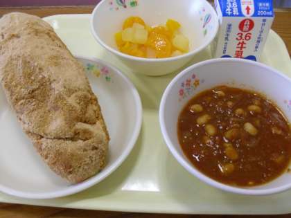 今日のメニューは、チリコンカン、きなこ揚げパン、フルーツ和え、牛乳です。