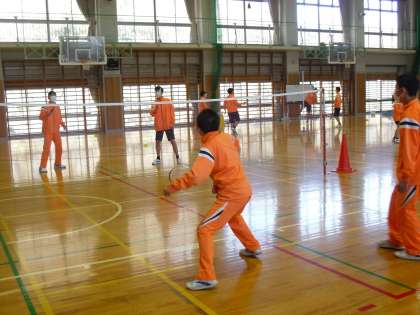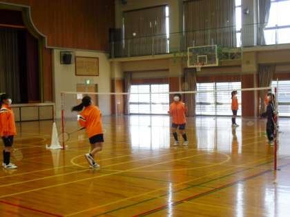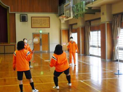 「バドミントン」ダブルスのゲームを行っていました。相手チームの位置関係や動きを見て、どこにシャトルを打ち込むか考えてプレーする様子が見られました。上達が感じられます。