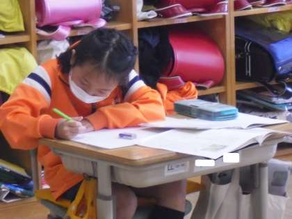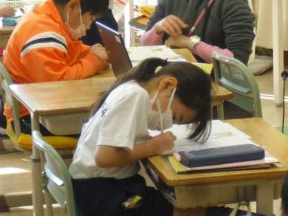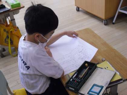 「何があったのかな」自分だけの物語をつくっているところです。みんな、一生懸命書いています。発表が楽しみです。