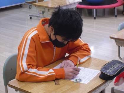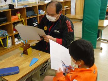 小D 図形の学習をしています。立体を作るために、直角に気をつけて紙を切っているところです。