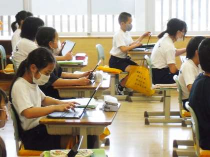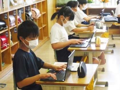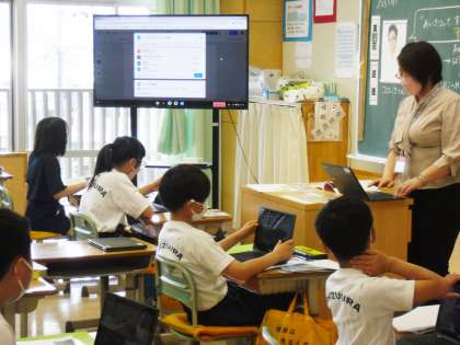 あいさつについて考えました。自分の意見をChromeBookにまとめています。先生が、みんなの意見をまとめた画面をモニタに映し出してくれます。