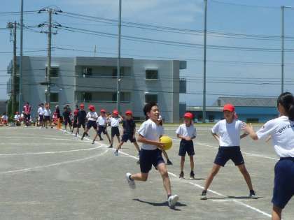 自治会種目は縦割りの14班でメデシングボールボール(改良版)を行いました。9学年が協力してゴールを目指しました。
