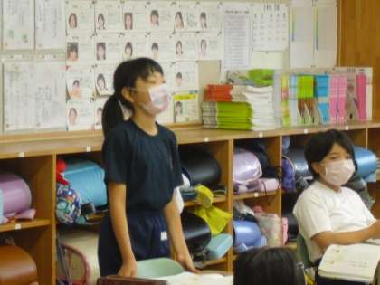 「調べよう まとめよう」百科事典を活用して、レポートを書きます。まずは、個人でどんなテーマにするか考えています。テーマを発表しているところでした。