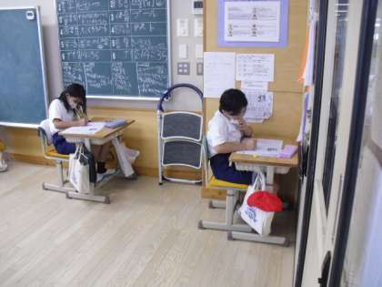 テストに取り組んでいました。説明文を読んで、どんなことを答えればよいのか、一生懸命考えていました。鉛筆の音だけが静かに聞こえてきます。プールの授業の後でしたが、みんなとても集中して取り組んでいました。