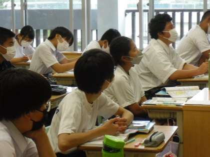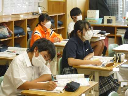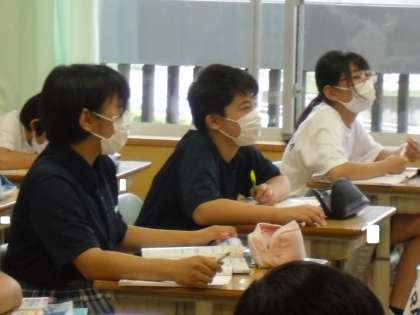 保健分野「調和のとれた生活」先生が子どものころの生活と、今の中学生の生活を比べていました。みんな興味深そうに聞いています。