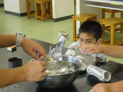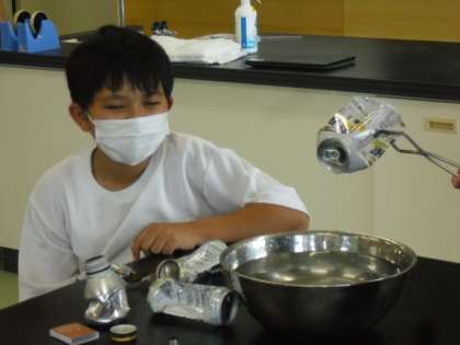 小C 理科 バーナーで熱したアルミ缶を急に冷やすとすごい勢いで凹みました。恐る恐る観察した後、考察に入ります。
