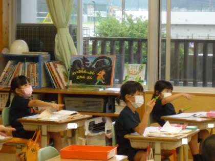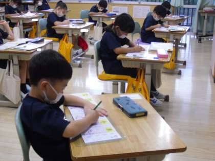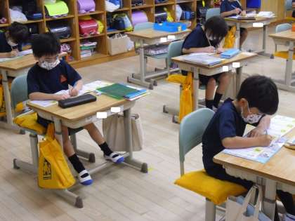 漢字の練習をしています。『出』の字の書き順を指で確認した後、姿勢を正してノートに丁寧に書いていました。