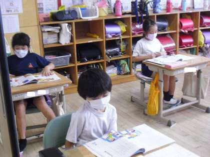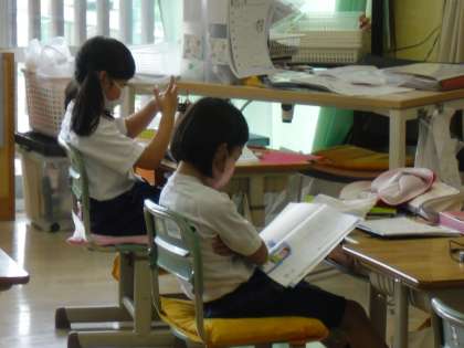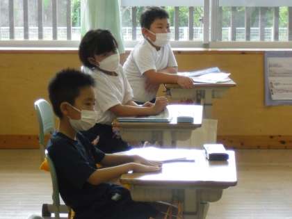 「かえるのおり紙」資料を先生といっしょに読んでいます。どんなお話か興味深く聞いています。