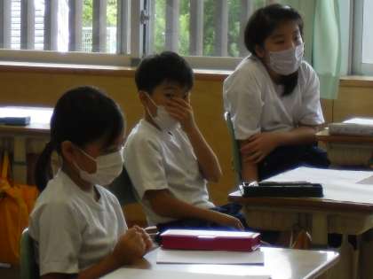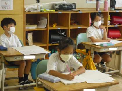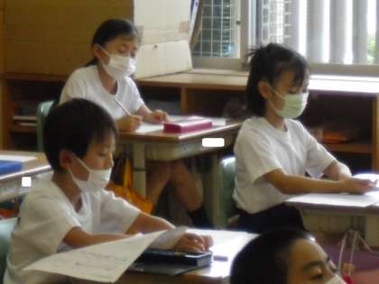 「読書感想文」3年生もこれまでにまとめた読書感想文シートを見たり、段落の説明を聞いたりした後、原稿用紙に読書感想文を清書します。