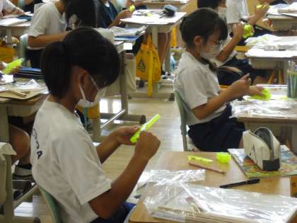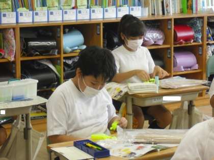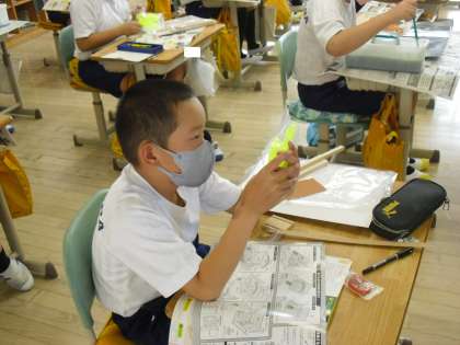 「わくわくプレイランド」木の板を切り分けたり、組み立てたりして、楽しく遊ぶものをつくります。説明を聞いて、作品をイメージしているところです。