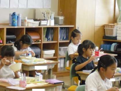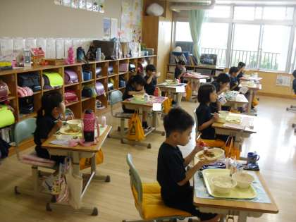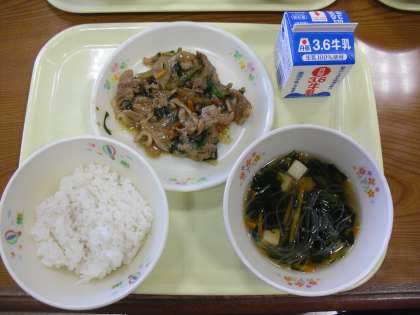 今日のメニューは、むぎごはん、牛乳、スタミナやきにく、はるさめスープです。給食の様子は1Aと2Aです。